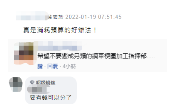 也有網友說,“真是消耗預算的好辦法!”“希望不要變成另類的網軍梗圖加工指揮部.....”“要有錢可分了。”