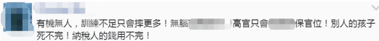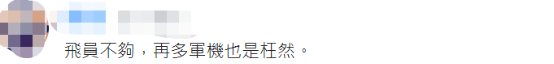有島內網友認為,飛行員不夠,再多軍機也是枉然。也有人認為,“有機無人,訓練不足只會摔更多!……別人的孩子死不完!納稅人的錢用不完!”↓