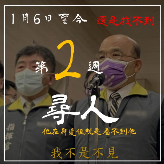 台鐵“太魯閣號”事故罹難者家屬1月3日在臉書發佈的“尋人啟事” 報道稱,“太魯閣號”事故罹難者家屬1月19日又在臉書貼出“太魯閣號”事件大事記,並諷刺從1月3日貼出尋找蘇貞昌的“尋人啟事”之後,蘇貞昌雖表示“不是不見”,但至今卻毫無消息:“1月6日至今,還是找不到”;“第2周尋人,他在身邊但就是看不到他。”。 台“行政院”發言人羅秉成20日晚對此聲稱,蘇貞昌於本月5日即已請他與“交通部長”王國材,先行與家屬團體進行溝通、收集意見,再來安排家屬與“院長”會面事宜,當日下午,王國材即與“太魯閣號”事故罹難者家屬代表王薇君以及家屬委任律師陳孟秀會談。在王國材與王薇君、陳孟秀會面後的一周內,他也於11日主動與王薇君聯繫,詢問其是否可協助整理家屬關切的相關議題及意見。 羅秉成還稱,當時他也征詢是否能由他先與家屬代表當面會談,王薇君雖答應會協助整理家屬關切的議題,但也轉達家屬“不願意見蘇‘院長’以外的人”的原則。羅秉成還聲稱家屬們在臉書的發文“有所誤會”。