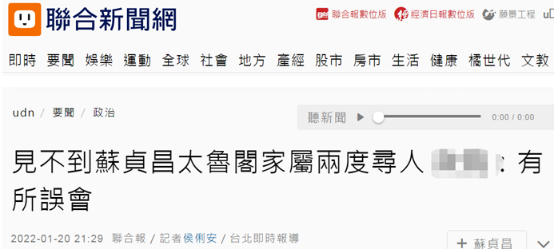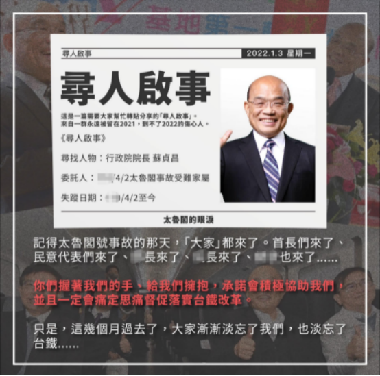1月19日,台鐵“太魯閣號”事故罹難者家屬又在臉書尋人 台媒此前消息稱,台鐵“太魯閣號”列車在2021年4月2日發生重大事故,造成49人罹難、247人輕重傷。台鐵“太魯閣號”事故的罹難者家屬2022年1月3日通過臉書發出“尋人啟事”,稱事發當天“民意代表”們、“部長”、“院長”等都到現場,並承諾“會積極協助”。然而,他們自2021年4月2日後就未得到“行政院長”蘇貞昌的關注及協助,蘇貞昌多次以“公務繁忙”為由拒絕與他們見面。2022年1月6日,蘇貞昌受訪時對此聲稱,“我不是不見”、“可能是個誤會”。