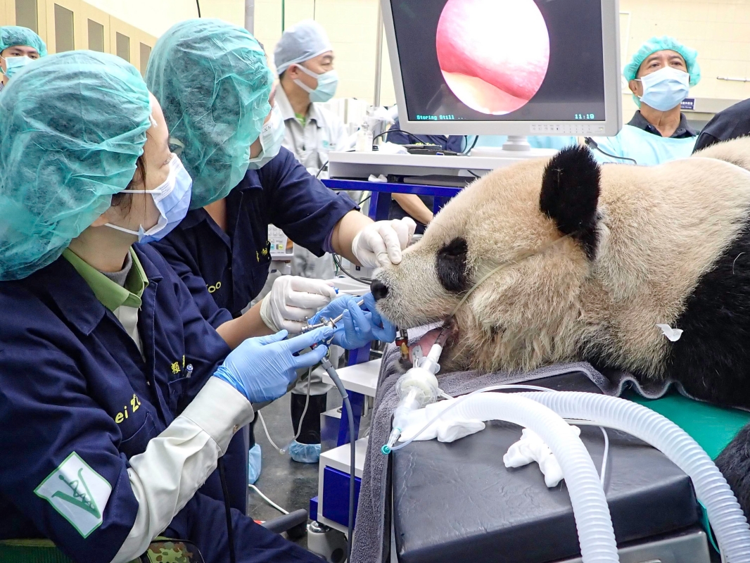 “團團”接受鼻腔鏡檢查 香港中通社圖片 值得注意的是,飼養員曾在處理“團團”食物的竹葉上發現水蛭,因此“團團”鼻腔有水蛭寄生的可能,照養團隊於是進行全面性的環境檢查,也利用大熊貓日常親近訓練的時機,在“團團”進入訓練籠之後,關閉周圍的光線,搭配手電筒光源引誘,嘗試確認是否有水蛭存在,但仍然未發現異常。