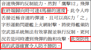 《海軍學術雙月刊》最新論文截圖 該篇論文的“重頭戲”就是鷹擊12導彈。文章稱,中國大陸自1970年開始研製超音速導彈,其後在蘇聯技術基礎上不斷自主研發,突破各種技術瓶頸。2015年“抗戰勝利70周年閱兵”,鷹擊12和鷹擊18兩款超音速導彈同時亮相,引發西方關註。這兩款導彈標誌著中國大陸在超音速導彈領域“早已今非昔比”。 鷹擊12與鷹擊18是中國大陸為滿足不同任務需求研製的導彈,後者以潛射為主,前者則有空射、艦載、岸基發射等多種型號。 文章稱贊,鷹擊12導彈具有極高的突防能力,末端速度可達4馬赫(即4倍音速);優秀的遠距離打擊能力,西方軍事評論家估計,其有效打擊距離達400-500公里,而美軍航母搭載的最新型E-2D預警機有效搜索距離僅321公里。