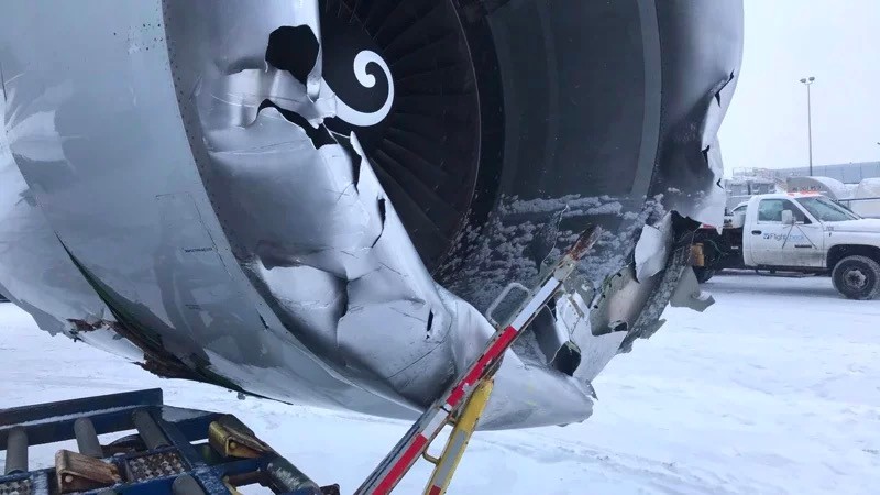 據台媒29日消息,台灣中華航空一架從美國安克雷奇起飛的波音747-400F貨機,當地時間28日早上降落芝加哥後,滑行時失控打滑,機身左側連續與多個行李車碰撞,發動機整流罩嚴重受損。(香港新聞網1月30日綜合) 【編輯:施鑫岳】