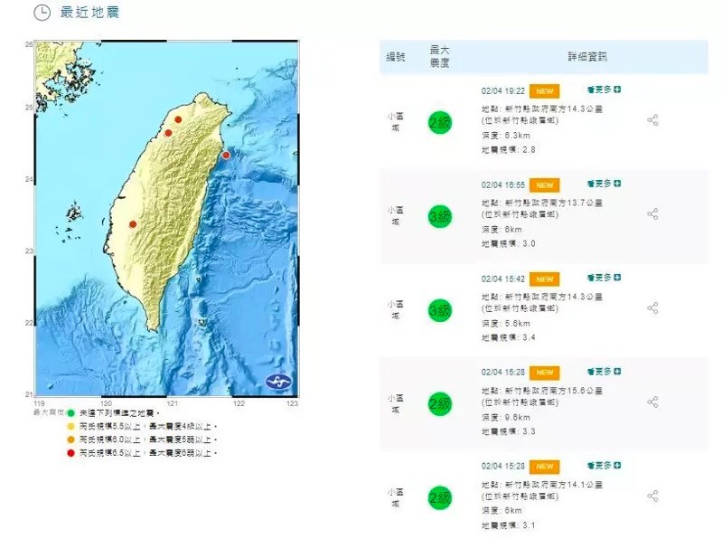 台氣象部門消息,4日上午10時44分至晚間7時22分,新竹地區連續發生10起小區域有感地震,震中皆在新竹縣峨眉鄉,規模里氏2.4級到3.7級不等。台地震測報中心指出,該地附近雖有活動斷層,但平時很少發生地震,這次連續發生地震在記錄上十分罕見。 ● 中華台北女足7名隊員確診新冠肺炎 中華台北女足代表隊4日在印度舉行的女足亞洲盃附加賽上,以3比0戰勝泰國隊。但據台媒報道,賽後有7名中華台北隊員確診新冠肺炎。台體育機構回應稱,正與相關單位協調專機返台與專案入境檢疫事宜。
