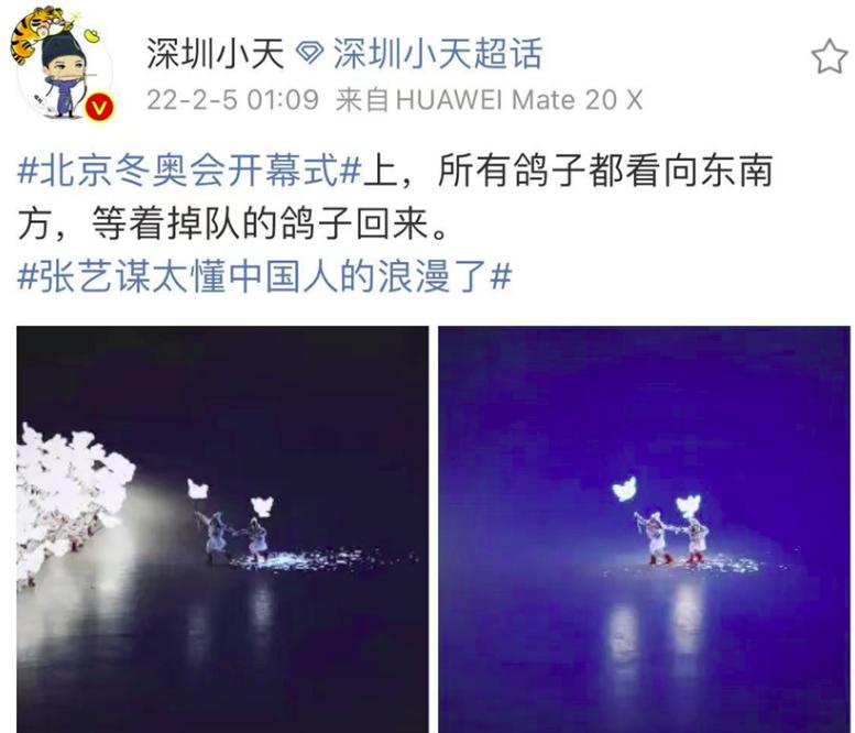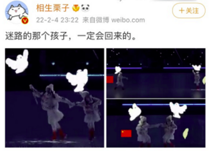 2月4日晚,在“鳥巢”國家體育場舉行的北京冬奧會開幕式上,一個由數百名小朋友手持和平鴿模型燈籠表演的節目《閃亮的雪花》讓許多網友在感動之余,從中看到了一層“隱喻”。 比如有網友說,“迷路的那個孩子,一定會回來的”。 還有網友說,“所有的鴿子都看向東南方,等著掉隊的鴿子回來”。 也有網友說,“早點回來,說的就是中國台灣”,“一鴿都不能少。” ↓