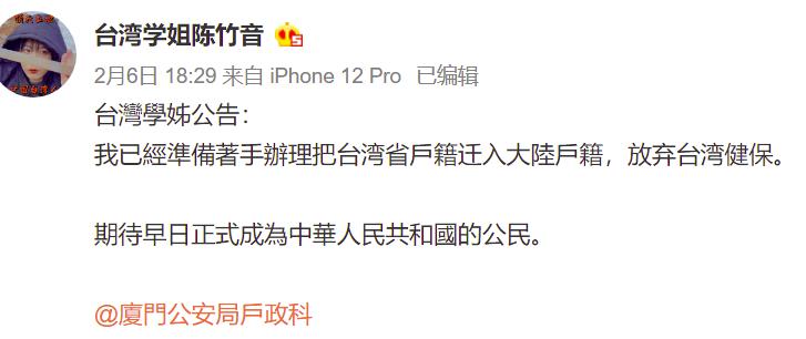 “期待早日正式成為中華人民共和國的公民。”2月6日,台灣武打動作演員陳竹音在微博宣佈,自己已經準備著手辦理把台灣戶籍遷入大陸,放棄台灣健保。