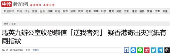 據“中時新聞網”和《聯合報》等台媒2月10日消息,台北市內湖區的台灣地區前領導人馬英九的辦公室9日收到恐嚇信件,疑似由香港寄出,信中內容聲稱“勿阻香港手足前往台灣!逆我者死”云云,還夾附2張冥紙。警方在信上採集到2枚指紋,正積極偵辦中。