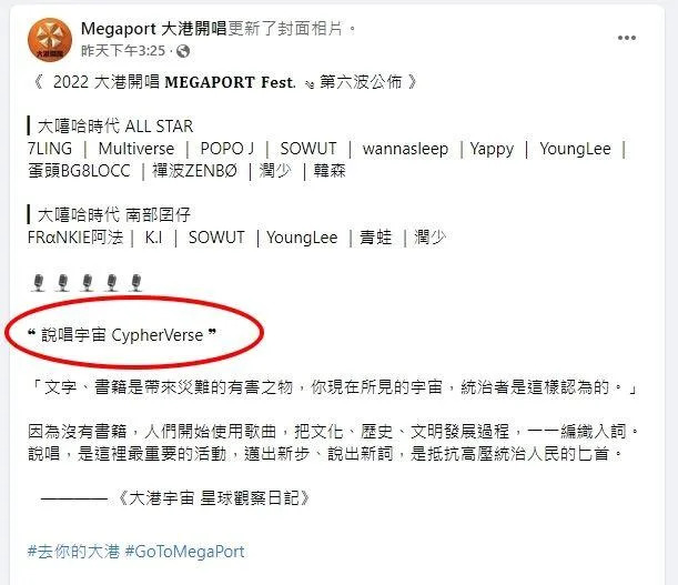 據台媒“中時新聞網”報道,高雄今年“大港開唱”的海報上標有“說唱”兩個字,被網友批評是大陸用語。資深媒體人黃暐瀚驚訝表示,這會不會矯枉過正?那還要不要用中文?還過不過農曆新年?還要不要拜媽祖關公?語言是約定俗成的,大家都懂就好,否則就是文化上的自卑。
