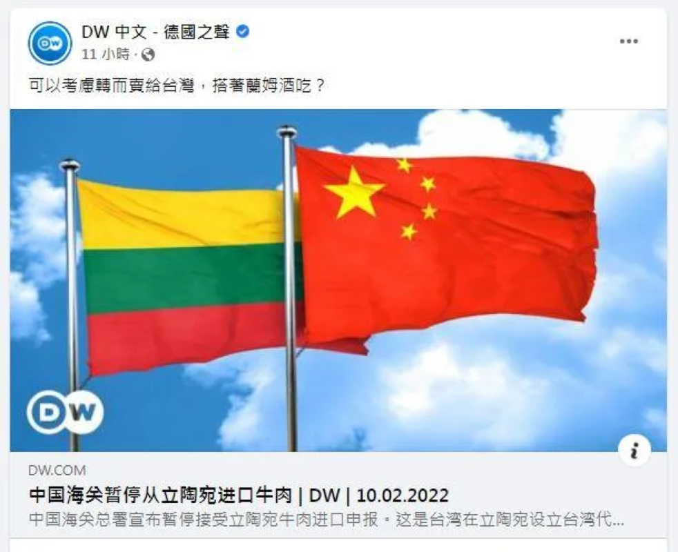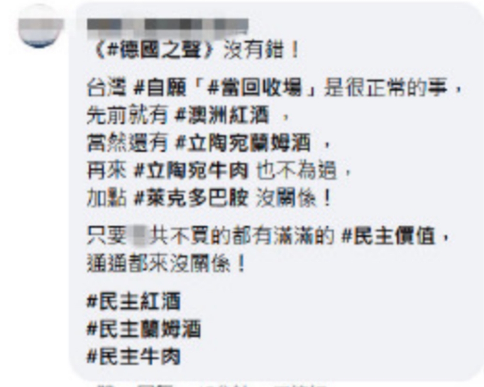 報道截圖 也有網友表示“德國之聲”並沒有錯,是台灣自願充當“回收廠”,“之前有澳洲紅酒、立陶宛朗姆酒(輸台),再來立陶宛牛肉也不為過,加點萊克多巴胺也沒關係”,該網友諷刺台當局,只要大陸不買的都有滿滿的“民主價值”,通通都可以送來給台灣民眾吃!