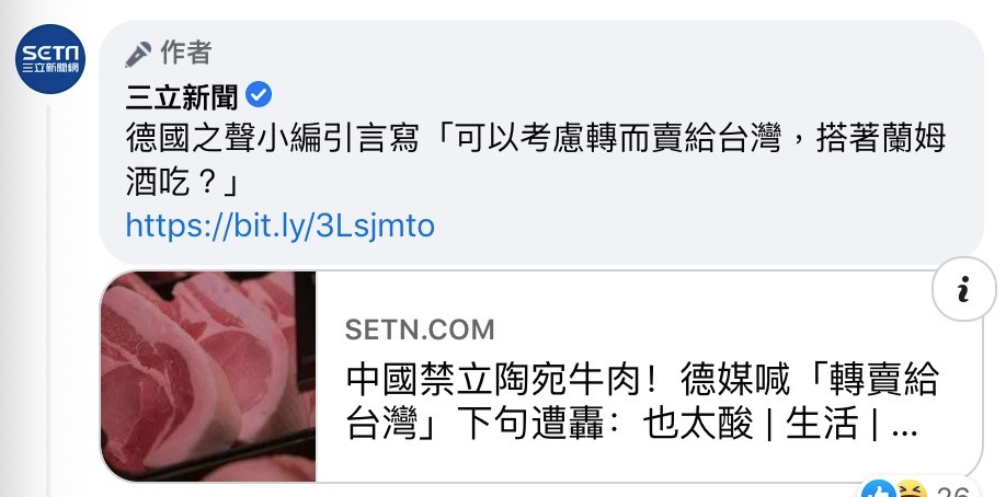 報道截圖 島內親綠媒體“三立新聞”發文稱,德媒小編此番言論是在酸諷台灣。在該媒體貼文的評論區,有網友認為德媒諷刺台灣被當成“回收廠”,叫囂德媒報道“不客觀”。還有人順勢表達了對立陶宛牛肉的支持,直呼“在台灣牛肉很有市場”。