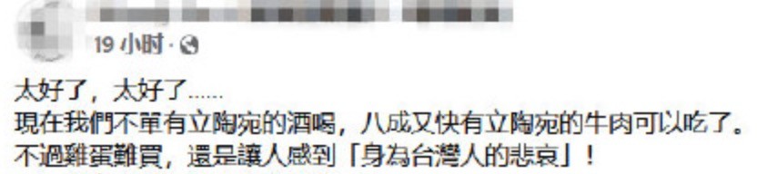 網友評論 也有網友諷刺,台灣民眾可以吃日本核食、美國萊豬、喝立陶宛的酒、吃立陶宛牛肉,就是買不到雞蛋。“讓人感到身為台灣人的悲哀!”