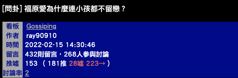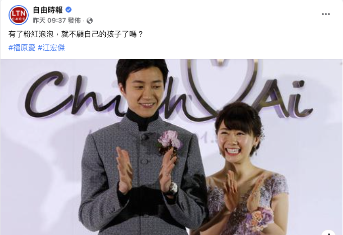 綠媒消息一出,有島內網友在台灣ptt論壇發帖質疑:“福原愛為什麼連小孩都不留戀?”該網友稱,福原愛跟江宏傑生了兩個小孩,卻說離婚就離婚,小孩也不想爭取,馬上就跟新歡結婚。“福原愛到底是經歷什麼,會不會無情過頭了?”