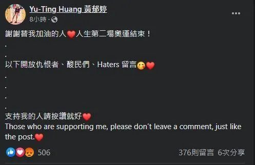 在島內遭網暴的中國台北冬奧運動員黃郁婷再發文,“開放酸民留言”分享到: