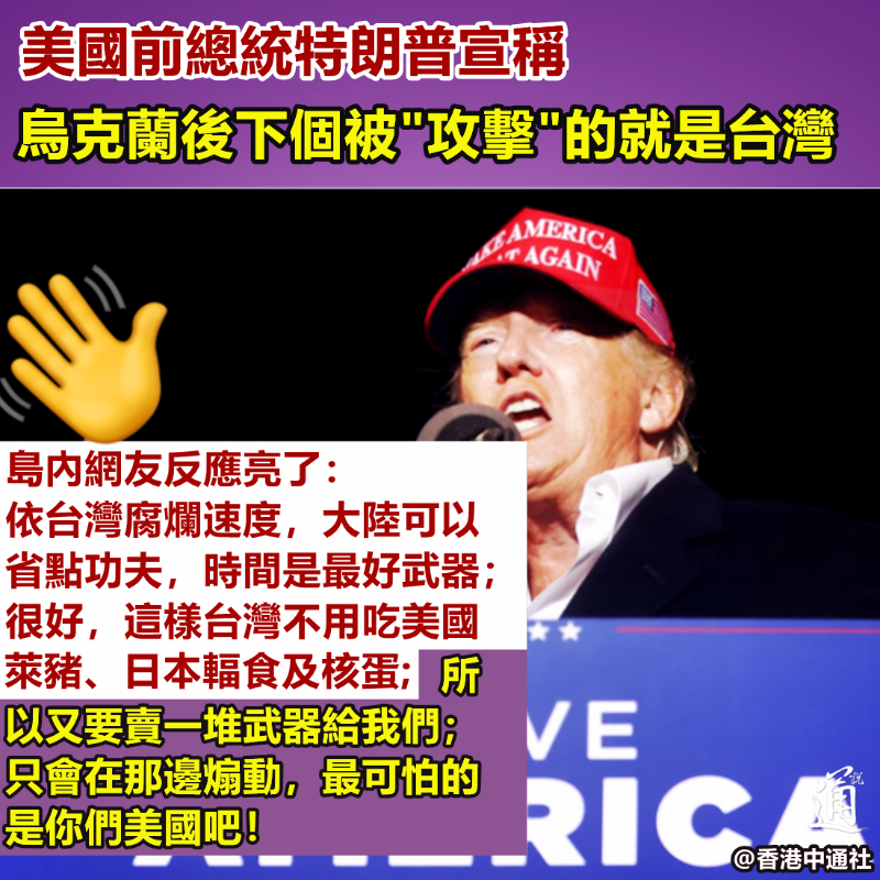 香港新聞網2月24日電 想賣軍火還是妄圖抹黑中國大陸?美國前總統特朗普又開“金口”,宣稱烏克蘭之後下個被“攻擊”的目標就是台灣。對此,島內網友的反應亮了! 特朗普23日在接受保守派的一個電台節目采訪時,聲稱在俄烏危機後,中國會是下一個積極采取行動的國家,中國大陸把俄羅斯對烏克蘭的行動視為“奪回台灣”的一大訊號。 特朗普還自誇稱,現在若是他執政,不論烏克蘭危機抑或台海危機都不會發生。他指責拜登領導能力不足,才會導致俄羅斯“入侵”烏克蘭。