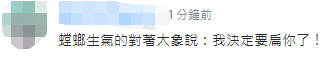 還有網友打了個比方,“螳螂生氣地對著大象說:我決定要扁你了!”有人諷刺,“這已經不是狗吠火車了,是螞蟻吠火車。” ↓