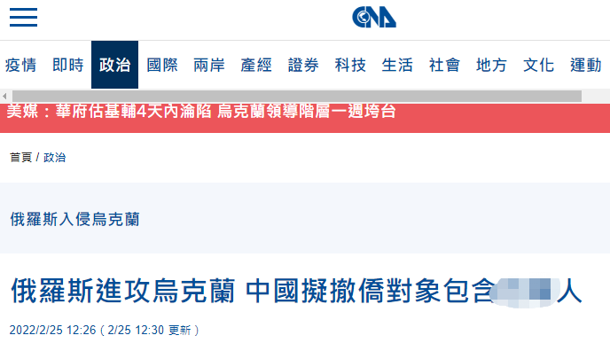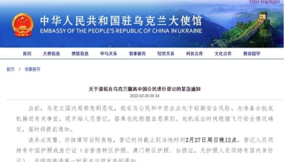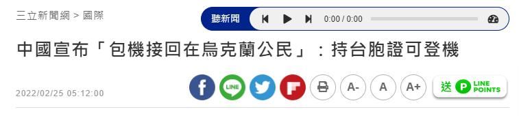 烏克蘭局勢惡化,中國駐烏克蘭大使館25日零時許發佈自烏克蘭撤離中國公民進行登記的緊急通知,通知稱在烏公民和中資企業處於較高安全風險,為準備分批包機接返有關事宜,開始人員登記,通知提到持台胞證者也可登記。這一消息很快引起島內媒體和網友的關注,有網友稱,“祖國溫暖點滴在心頭”。然而這件事卻被台當局外事部門抹黑為“操弄政治宣傳”。 中國駐烏克蘭大使館微信公號25日發佈“關於請擬自烏克蘭撤離中國公民進行登記的緊急通知”,稱當前,烏克蘭國內局勢急劇惡化,我在烏公民和中資企業處於較高安全風險。為準備分批包機接返有關事宜,現開始人員登記。搭乘包機根據自願原則。包機派出時間根據飛行安全情況確定,屆時將提前通知。 通知稱,登記人員須持有中國護照或旅行證(含香港特區護照、澳門特區護照、台胞證,無護照人員須持有國內身份證)。後續安排請第一時間關注使館發佈的通知。 這個消息在島內引起了一些媒體的關注,并作出報道。