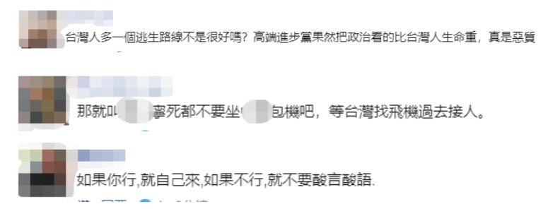 還有人毫不客氣地說,“台灣人多一個逃生路線不是很好嗎?高端進步黨(指民進黨)果然把政治看的比台灣人生命重,真是惡質。”“那就叫民眾寧死不要坐大陸包機,等台灣找飛機過去接人。”“如果你行,就自己來,如果不行,就不要酸言酸語。”