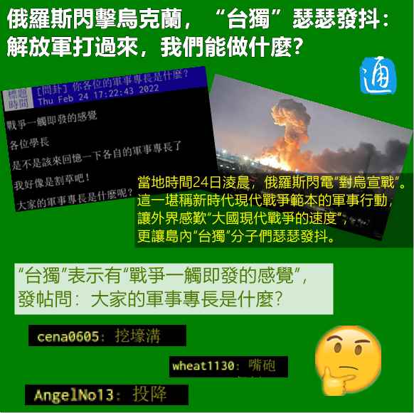香港新聞網2月25日電 當地時間24日凌晨,俄羅斯閃電“對烏宣戰”。目前,這場包含了外交閃擊、輿論閃擊和軍事閃擊等多個內容的“閃擊戰”,俄羅斯明顯已經大獲全勝。這一堪稱新時代現代戰爭範本的軍事行動,讓外界感歎“大國現代戰爭的速度”,更讓島內“台獨”分子們瑟瑟發抖。 島內綠營論壇上就有人談及“戰爭一觸即發的感受”,並發帖詢問“大家的軍事專長是什麽?”留言者眾,答案也五花八門,有人回答會“嘴炮”,有人回答會“做假文件”……反正多數答案都挺“幽默的”。