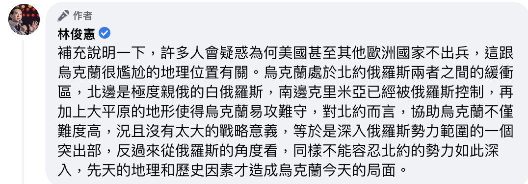 面對俄烏情勢,美國做法令人唏噓,但仍有台灣綠營人士沉浸在“台灣對美國來說不一樣”的幻想中,更為美國不出兵想盡理由。 民進黨“立委”林俊憲將美國及歐洲國家不出兵的原因歸結為烏克蘭尷尬的地理位置。他聲稱,烏克蘭處於北約與俄羅斯之間的緩衝區,北邊是極度親俄的白俄羅斯,南邊是已經被俄羅斯控制的克里米亞,再加上大平原的地形使得烏克蘭易攻難守。對北約而言,協助烏克蘭不僅難度高,且沒有太大的戰略意義,等於是深入俄羅斯勢力範圍的一個突出部。