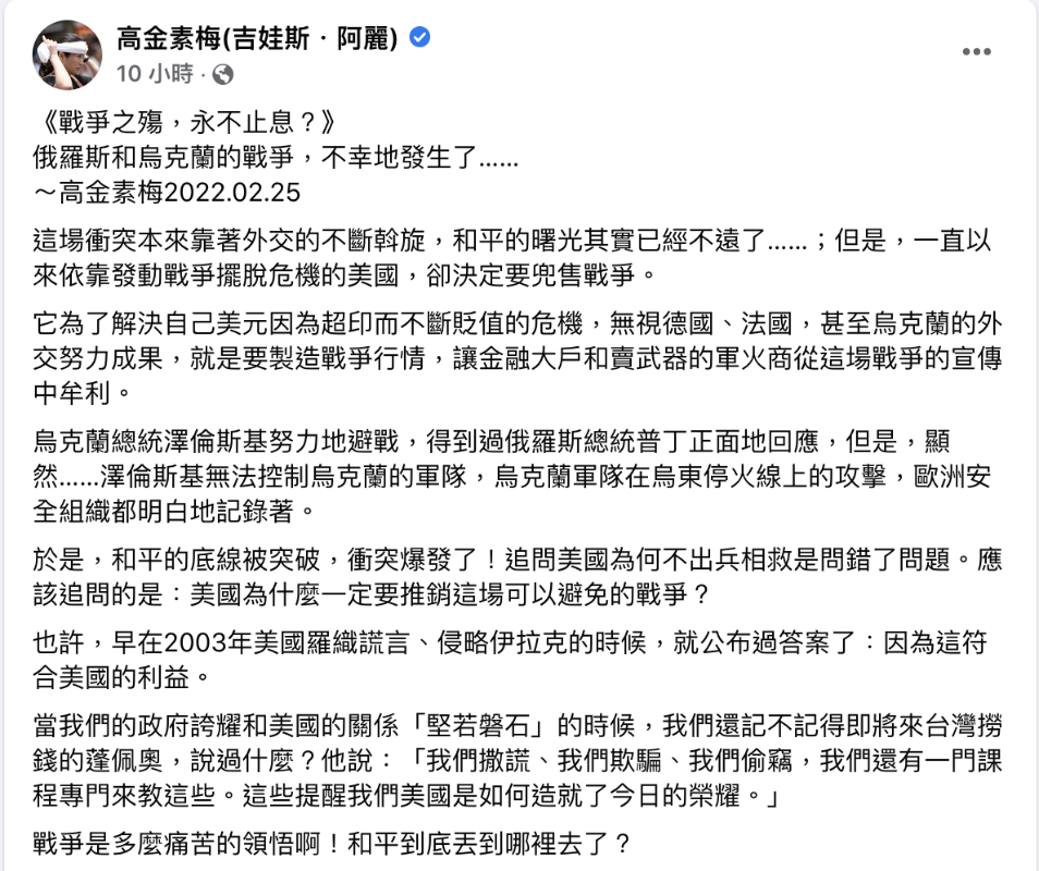 島內經濟學家吳嘉隆也為美國的袖手旁觀找補。他自鳴得意地稱,烏克蘭的地緣政治分量“差台灣很遠”,美軍真要打仗的話,首選是針對大陸、“保護”台灣。他還揚言,美國不怕中俄軍事同盟,一個打兩個完全沒問題。 按照這位經濟學家的臆想, 美國是“項莊舞劍,意在沛公”,表面上應對不斷升溫的烏克蘭危機,實際是處心積慮地謀劃如何在西太平洋對付大陸。“如果真正要打世界大戰的話,(美國)首選當然是(為)台灣,而不是烏克蘭。” 吳嘉隆斷言,烏克蘭不是美國的核心利益,台灣才是美國的核心利益,也是日本的核心利益。“美軍真要開幹的話,當然是針對大陸,保護台灣。” 事到如今,綠營還在秀優越感,眼明的島內網友看不下去了! 面對綠營的“地緣優越感”,有網友直呼“洗洗睡吧”,“北約救烏克蘭可比美國遠渡重洋救台灣簡單多了!”有網友指出,“台灣連聯合國會員都不是,離美國那麼遠,離大陸那麼近,美國更不會來幫了!” “台灣(民眾)早就被洗腦了!” 有網友稱,島內一些人不僅相信美國會幫,還認為台灣戰力優越。有網友忍不住諷刺:“台灣跟烏克蘭不一樣,但是美國的怯戰打嘴炮卻是一樣的。” “美國人已經不想幫別人打仗了!”有網友直言:“看看阿富汗,看看烏克蘭,美國吃乾抹淨就閃人了。” 連島內律師、綠營人士吳秋遠也指出,國際社會裡,很多國家都只是紙老虎,所以不要過於相信國際社會,他們的所謂支持,都是說說而已。“而每個國家選邊站的理由,往往不是為了公平正義,而是為了自己的利益!” 島內“立委”高金素梅今日發文指,追問美國為何不出兵相救是問錯了問題,應該追問的是“美國為什麼一定要推銷這場可以避免的戰爭?”
