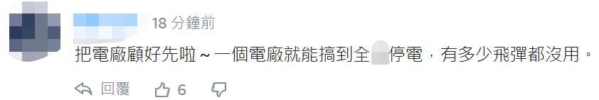 也有網友表示,“把電廠顧好先啦~一個電廠就能搞到全台停電,有多少導彈都沒用。”↓