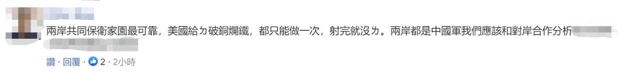 更有網友說到,“兩岸共同保衛家園最可靠”并表示“兩岸都是中國軍(隊)我們(指台灣)應該和對岸合作……” ↓