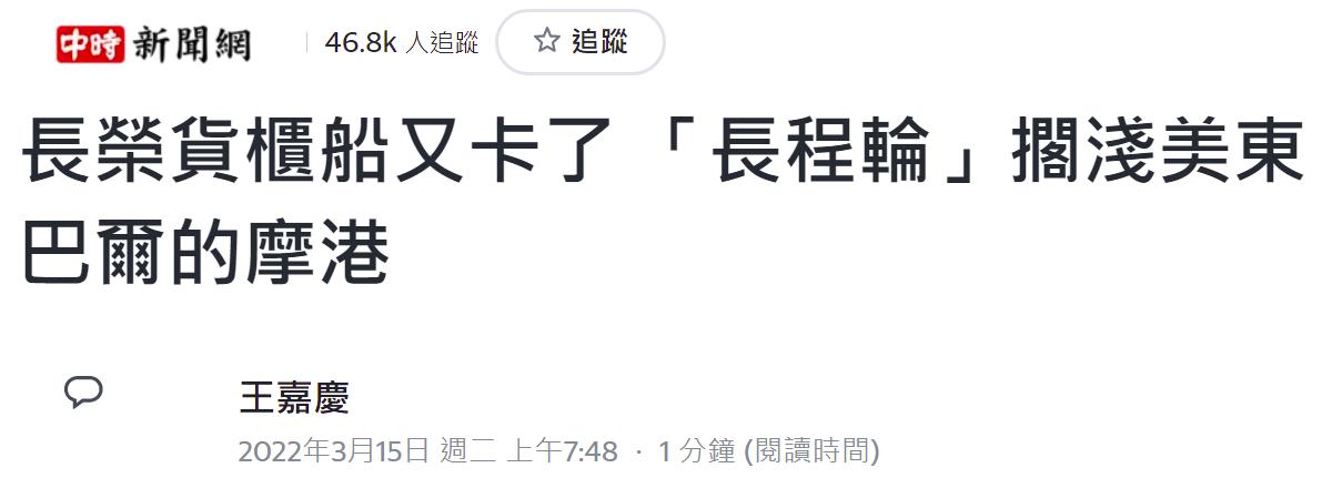 台灣中時新聞網報道截圖 據中時新聞網報道,“長程輪”上周日晚駛離巴爾的摩港沒多久即擱淺,原本要前往弗吉尼亞州,結果在切薩皮克灣(Chesapeake Bay)附近卡住。這艘貨輪長334米、寬48米,可裝載11850個20英尺(一英尺約等於0.3米)標準貨櫃,屬11萬噸級。 報道援引馬裡蘭州管理局的消息說,“長程輪”雖然擱淺,但不影響其他船只進出巴爾的摩港。目前正嘗試讓貨輪脫困,救援持續進行中。 中時新聞網稱,“長程輪”主要負責亞洲往返美東航線,由長榮香港公司持有,前年才投入營運;它也是長榮海運向韓國三星重工下單建造的8艘11萬噸級貨櫃輪中的第四艘。 去年台灣長榮海運長達400米的“長賜輪”卡住蘇伊士運河近一周,導致逾400艘往來船只無法通行。 【編輯:俞丹鳳】
