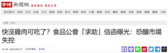 台灣中時新聞網報道截圖 中時新聞網稱,台灣農業專家“Lin bay 好油”16日在臉書貼出“台灣區冷凍食品工業同業公會”發給“農委會”的函,稱會員反映各地暴發禽流感疫情,導致近期雞肉供給數量將出現短缺,恐有造成消費市場失控之虞。 “台灣區冷凍食品工業同業公會”人員17日接受中時新聞網采訪時,證實公會發過此信函,并表示日前禽流感疫情暴發,產蛋雞被撲滅,因此導致雞蛋短缺,“接下來可能雞肉也會有同樣的狀況!” 食品公會表示,台灣的雞肉供給分為自產與輸入,輸入的部分主要來自美國,但至16日為止美國已有15個州被公佈是疫區。除此之外,同業公會還稱,新冠疫情讓航運等全都大亂,有些肉品其實早在一個月前就已送到港口,卻因為排隊關係上不了船,如今成為疫區,只要一通報港口就會禁止相關肉品上船,導致這些沒問題的肉品也無法來台。 食品公會透露,目前短缺的情況已經讓會員們開始緊張,雖然因為還有庫存,雞肉短缺問題并沒有實際發生,但恐會在四五月出現。