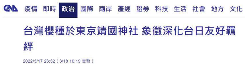 “中央社”、《自由時報》等多家台媒炒作,在台灣和日本民間人士的“聯手推動”下,17日在日本的靖國神社種下來自台灣的櫻花苗木。對此,有島內網友罵道:成天想跪舔“殺人王”,不犯賤嗎?也有網友表示,靖國神社是祭拜戰犯的地方,“在那植樹很光榮嗎?垃圾。”