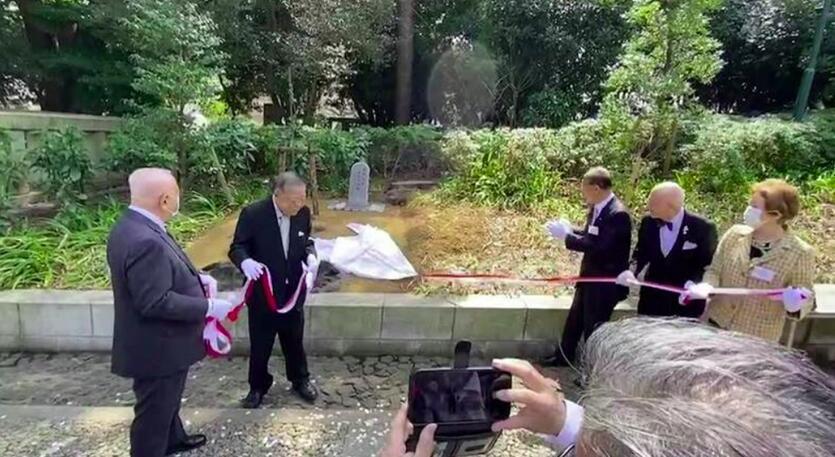 來自台灣的櫻花苗木17日在靖國神社種下,圖為當時正舉辦種植和紀念碑揭幕儀式。圖自台媒