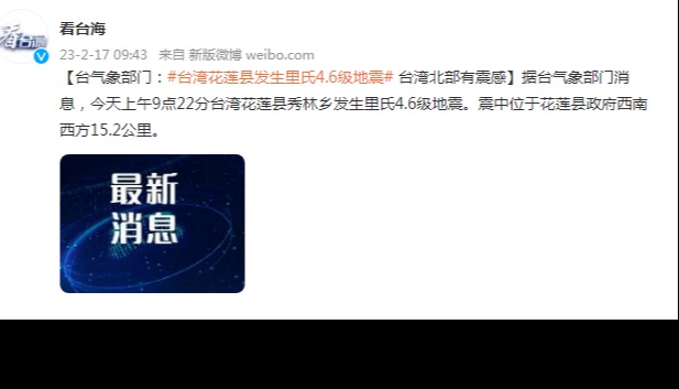 香港中通社3月24日電 台北消息:花蓮縣豐濱鄉及台東縣長濱鄉24日上午8時38分同時發生地震,分別為里氏5.3級與4.7級。