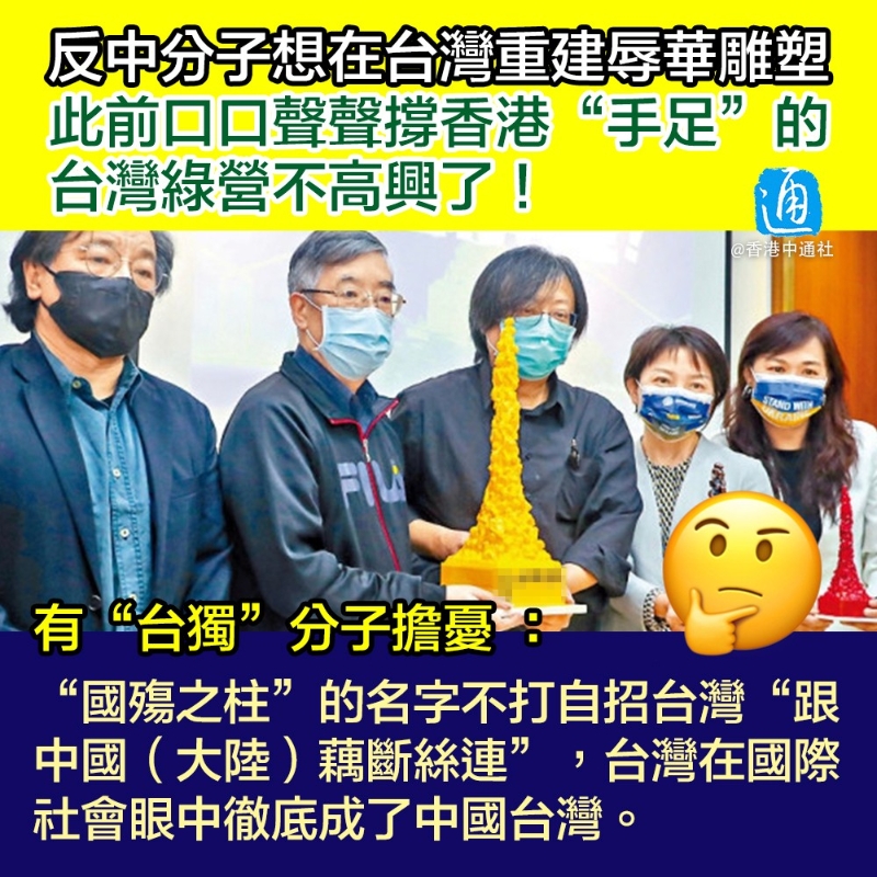 對此,香港立法會議員葛珮帆認為事件可能違反香港國安法。她表示,主辦人士過往涉嫌鼓吹“港獨”和“台獨”,或會利用雕塑鼓吹分裂國家。她強調,香港國安法適用於香港境外任何地方,香港警方應依法處理,必要時可發出通緝令。 “40萬一個模型…好大的生意。”有香港網友揶揄“黃絲”的錢太好騙了,質問該組織“既然這麼有心,為什麼不自己出錢?” “黃絲”向來以為台灣綠營與他們站在同一“戰線”,未料台綠營聽說辱華雕塑將在台灣擺放後的反應卻是百般嫌棄! 島內“綠委”林靜儀聲稱遷入“國殤之柱”令台灣“被吃豆腐”,讓外界覺得台灣是中國的一部分。 聲援所謂“國殤之柱”落地台灣的“綠委”范雲則想要為其改名為 “恥辱柱”,又聲稱這個雕塑在台灣必然要與台灣的歷史結合。 不過,即便台“綠委”妄圖為該辱華雕塑改名,亦惹得島內網友質疑聲一片! 有台灣網友不滿民進黨屢次干涉香港事務、強行碰瓷。 也有“台獨”分子擔憂,“國殤之柱”的名字不打自招台灣“跟中國(大陸)藕斷絲連”,台灣在國際社會眼中徹底成了中國台灣。