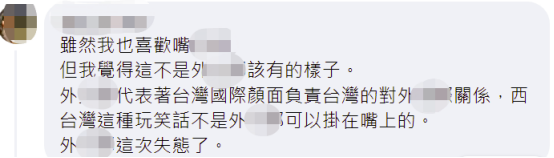 有網友覺得這不是台外事部門該有的樣子,“‘西台灣’這種玩笑話不是‘外交部’可以掛在嘴上的。‘外交部’這次失態了。”↓