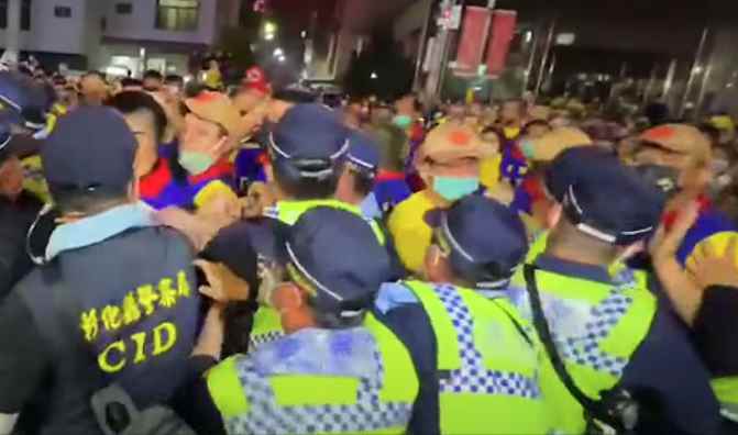 衝突畫面 視頻截圖 據台媒報道,台中大甲鎮瀾宮媽祖鑾轎9日晚行經彰化市時,張安樂率領“統促黨”成員想要接轎被警方擋下。警方要求張安樂等人拿出大甲鎮瀾宮的疫苗接種卡,不然不准他們進入管制區接轎。雙方隨後發生推擠衝突,造成3名警員受傷,警方也逮捕6名涉事人員。 台警政部門負責人陳家欽10日前往彰化查看受傷警員。他聲稱,9日晚有“黑道幫派分子”藉參與宗教活動名義擾亂社會秩序。警方已成立專案小組進行偵辦,至於是否有“紅色勢力“介入造成衝突,也是偵辦重點。 對於陳家欽這番說辭,有網友質疑民進黨當局又在操作“抗中保台”升高兩岸對抗;亦有人直言,神明不分政黨,任何人都有參拜的權利,宗教活動不應牽扯到政治陰謀。(完) 【編輯:李雪萍】