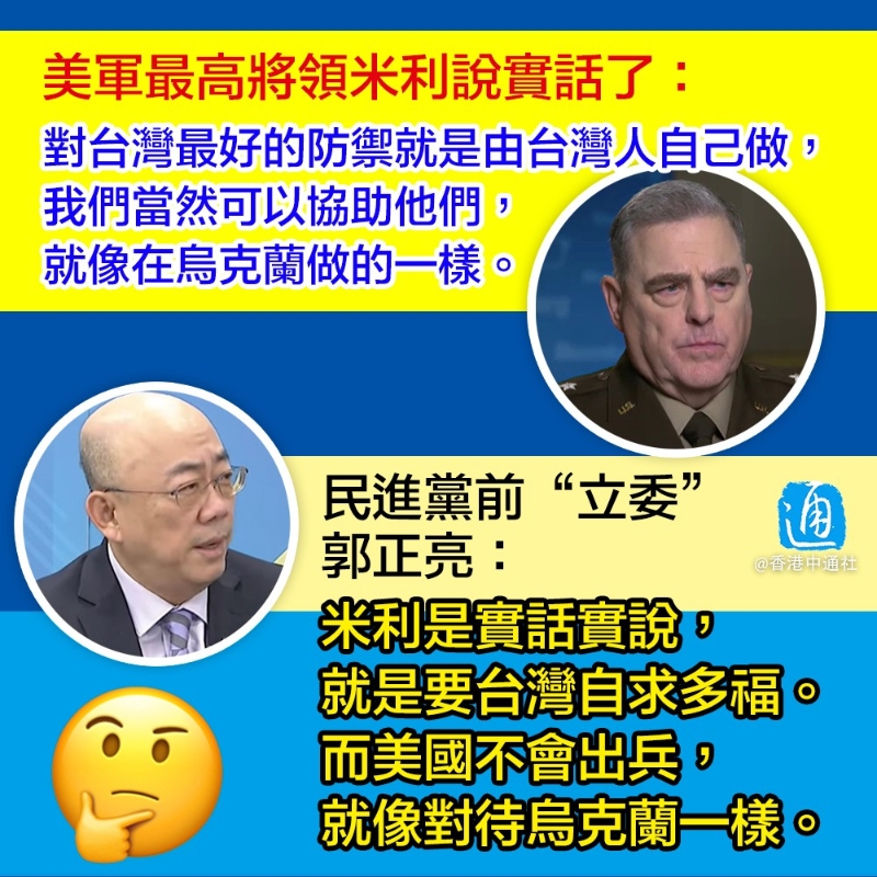 美軍參謀長聯席會議主席米利(視頻截圖) 據《美國之音》報道,美軍參謀長聯席會議主席米利日前在美國國會一場聽證會上,就“如何協助台灣阻遏解放軍的攻擊”答覆稱,對中國大陸最好的威懾就是“確保中國(大陸)知道,如果他們要攻打台灣,那會是一個非常難以攻佔的目標”。 他聲稱,美國有必要協助台灣“自我防禦”,但強調 “對台灣最好的防禦就是由台灣人自己做,我們當然可以協助他們,就像在烏克蘭做的一樣。” 《美國之音》又採訪了美陸戰隊退役教授亨澤克,他認同米利的說法,聲稱美國加強對台灣的軍事協助非常重要,“但台灣自己的作為才是重要關鍵。” 亨澤克還提醒,所有台灣民眾都必須要為可能發生的戰爭做好準備,以便台海開戰後民眾都知道應該有何行動。 對於亨澤克的所謂“提醒”,有島內網友自嘲稱:“烏克蘭民眾有邊境可以逃離,挑釁者有飛機可以逃離,而台灣民眾(想)逃離台灣,只能去投海。” 對於米利的最新回應,民進黨前“立委”郭正亮日前於一評論節目上分析稱,米利是實話實說,就是要台灣自求多福,進行海上決戰或城市戰。而美國不會出兵,就像對待烏克蘭一樣。