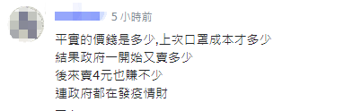 有網友直斥台當局發疫情財,怒斥之前配售口罩的售價遠大於收購價,即便後來賣4元(新台幣,下同)1個,都比未推出“口罩實名制”時要貴很多。