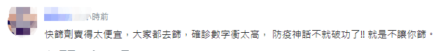 還有網友直言,台當局此舉就是“不讓你篩”,因為快篩試劑價格太低,擔心大家都去篩,確診數字衝太高,防疫神話就破功了。