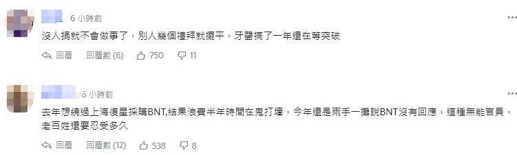 還有網友表示,“又來了,同樣的疫苗同樣的問題竟然會(在台灣)再發生一次”、“時中很會演,劇本可以換嗎?”