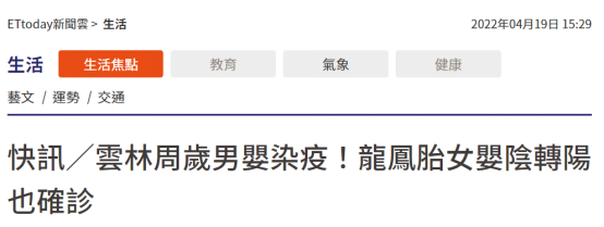 台媒:雲林縣年僅一歲龍鳳胎先後確診,為“全台年紀最小確診病例”分享到:
