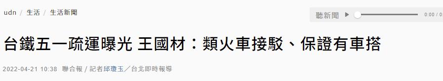(台灣“聯合報”圖片) 據台媒報道,因不滿台灣交通部門未充分溝通,就把《台鐵公司化條例》草案送進台立法機構審議;於是,台鐵企業工會(簡稱“台鐵工會”)打算發起“五一”合法休假行動。 對此,台鐵預估最糟糕的情況,恐怕只能開出17個班次,台鐵運能逼近停擺。 眼見鬧了矛盾,台灣交通部門日前趕緊表示:會有因應方案,並將於明天(4月22日)正式宣佈;而台立法機構今天(4月21日)上午也正好要審查《台鐵公司化條例》草案,“五一”到底怎麼疏運,受到多名“立委”關注。 到時候怎麼疏運?台灣交通部門負責人王國材的回應是:“五一”勞動節那天,如果台鐵員工不來上班,就請乘客不要去搭了。 “立委”繼續追問,王國材才又繼續給出答案:西部由高鐵、客運支援,運能方面沒有問題;東部則會開“類火車”,也就是遊覽車當火車走,沿著台9線行駛,並以台鐵每個車站當做停靠點,保證讓旅客有車可以搭。 不過這樣的應對方案,立刻遭到“立委”質疑,指屆時遊覽車都開到台9線上,豈不是更塞車,難道又要民眾做“聰明的用路人”嗎? 所謂“聰明的用路人”,是指2020年台灣端午節假期首日,適逢疫情解封,全台各地湧現車潮,引發民怨,時任交通部門負責人的林佳龍卻表示,民眾要做一個聰明的用路人,能夠“趨吉避凶”,一度引發爭議。 而如今,對於“立委”的質疑,王國材則表示:保證一定有車可以搭,交通部門管的是台鐵的疏運,只要民眾到台鐵車站來,就可以有車搭。 雖然王國材稱“保證民眾有車搭”,但台灣民眾對此并不看好,隨即“類火車”這個荒誕的新名詞,也被搬到台灣PTT論壇上,島內網友也是紛紛痛批民進黨官員“類上癮了”: “正事不做整天創造名詞騙人。” “無能只能又創新名詞。” “類官僚講類幹話,又發明類火車。” “從來不知道‘類’字這麼好用。” ……
