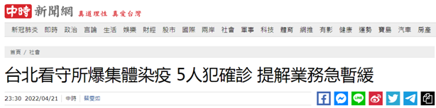據台灣“中時新聞網”消息,島內疫情持續蔓延,各地出現確診者。因台北地檢署一確診法警18日曾隨車進入台北看守所提審犯人,看守所緊急對20多名管理員、犯人進行病毒檢測,21日傳出至少有5名犯人核酸結果呈陽性。台北看守所自今天(22日)起,暫停所有犯人的移監業務,並通知轄區各地檢署與法院,建議暫停押送犯人,同時擴大病毒檢測範圍。
