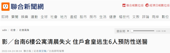 台灣“聯合新聞網”報道截圖 據報道,台南市消防局救災救護指揮中心今天凌晨3時14分接到報案稱,位於東區裕豐街54巷一棟6層公寓失火。隨即派出多支消防分隊出動救援。消防人員到場後,發現這棟6層樓的公寓大廈5層有明火和濃煙竄出,火勢延燒到4層,於是馬上拉水帶上樓滅火,火勢於3時41分熄滅。