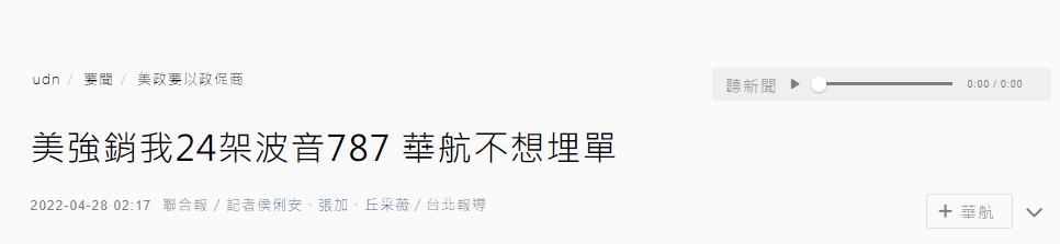 台媒踢爆美議員逼台灣买飛機!民進黨急了:絕非“強硬推銷”…香港新聞網4月28日電 台湾“聯合報”今天(4月28日)一則題為“美強銷我24架波音787,華航不想埋單”的報道,又讓台灣民進黨當局跳腳了。 對於該報道,民進黨當局特意出來解釋稱:美國議員是关心和帮助自己國家的產業,絕非“強硬推銷”;更有民進黨籍“立委”宣稱:不去推銷的議員才是失職!