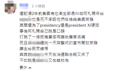 還有網友表示,兩年前時任美國衛生部長的阿札爾來台,台灣民進黨當局也是不承認美方在推銷“萊豬”(含萊克多巴胺美豬),然後搞突襲宣佈開放“萊豬”進口,讓全台民眾錯愕,認為今天民進黨當局又在“裝肖維”(指裝瘋賣傻)。
