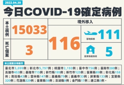 ● 台灣單日新增本土確診破1.5萬 台灣流行疫情指揮中心4月30日通報,新增15149例新冠肺炎確診病例,分別為15033例本土病例及116例境外輸入病例;另新增3例死亡。島內已連續3天單日確診超過萬例。 ● 4月30日2架解放軍軍機巡台 台防務部門4月30日晚公布,當天2架解放軍蘇-30戰機進入台西南空域。今年以來解放軍軍機累計巡台87天。