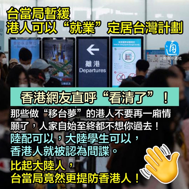 香港新聞網5月4日電 近年,竄逃台灣的港人不斷喊話台灣當局給予移台港人定居許可。或是擔憂“誠信破產”,台當局看似終於有所行動了。此前,台當局“高調”宣布會於5月1日放寬香港人可以“就業”定居台灣,結果數名民進黨“立委”卻跳出來反對,聲稱“有國安疑慮”。 台當局其後宣布暫緩計劃。對此,有看破真相的香港網友提醒那些做“移台夢”的港人不要再一廂情願了,“人家自始至終都不想你過去!”