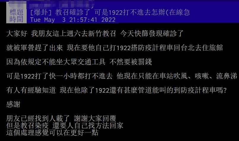 (截圖:台灣論壇PTT) 據台媒報道,日前,有台灣網友在網絡論壇PTT發文,指自己的一位朋友於4月30日趕到新竹縣參加教召,結果因為他在5月3日快篩時驗出陽性,竟然當天晚上就被趕出了營區。而且,部隊還要他自己打電話給1922(台灣免付費傳染病咨詢專線),自己叫防疫計程車回台北去住防疫旅館。 該網友表示,按照規定,確診者不能搭乘大眾交通工具,否則會被罰款,但朋友打了將近1小時的電話,都在忙線中,完全打不通,只能一人呆站在車站,吹著冷風、咳嗽、流鼻涕,感到非常淒涼,所以特意來網上幫朋友詢問“除了1922,還有什麼管道,能叫得到防疫計程車嗎?” 該貼文隨即引發了熱烈討論,不少網友直接砲轟台軍方面趕人出營區的行為,並建議撥打台灣防務部門的申訴專線1985或是新竹衛生局的電話: “打1985是最好的選擇。” “打1985,現在這支電話效率很好。” “打給1985就會處理很快了。” “找當地的新竹衛生局。” 不過,值得注意的是,雖然不少台灣網友都建議這位求助網友打給1985,但這條專線可能也打不通,因為1985近日來也是被頻繁踢爆“無視投訴”。