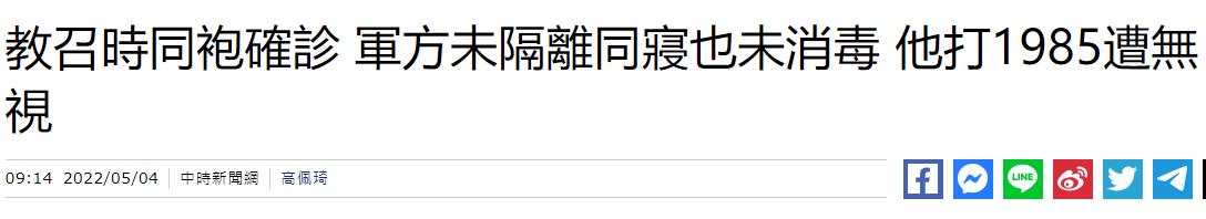 (截圖:台灣“中時新聞網”) 據台灣“中時新聞網”5月4日報道,有台灣網友在“爆料公社”控訴,因為疫情嚴峻,所以在參加教召時,特意準備了防護力較高的口罩,但卻遭部隊拒絕並表示“必須統一使用公發款”,不料隔天就有人確診,而部隊不僅沒有做基本消毒,還要求同寢的室友在解召時收拾確診者遺留的物品。 這種不合常理的做法,引發了發帖者的憤怒反應,於是就打電話到1985申訴,但沒想到,客服居然冷冷地回了一句:“所以呢?你的訴求是什麼?” 類似的荒唐事件還有不少。 據台媒報道,近日台灣屏東縣枋寮營區發生教召員確診後,台軍方卻並未有任何科學安排,僅在解召時給每人一份快篩試劑,就讓他們回家自主隔離;結果,有健康入營的民眾也被傳染,在解召後確診,整整半個月不能工作。 對於“新竹有教召員確診即被趕出營區,而屏東卻沒有提前解召”這個問題,中國國民黨文傳會副主委林家興表示,從兩次事件看來,台防務部門對於確診教召員並沒有統一的處理方式,這點台防務部門有必要出來說清楚、講明白。 中國國民黨文傳會副主委何志勇也指出,教召若要持續進行,民進黨當局就要擔起照顧教召員的責任,做不到就應先暫停,蔡英文千萬不要讓社會覺得“你對網軍比對部隊更好!” 針對網友指控“教召確診被趕出營區”一事,台灣防務部門“陸軍教育訓練暨準則發展指揮部”回應指是“依法辦理解召”,若有未周之處,單位會再精進作法,強調已向教召員說明原委,並將持續關懷問候。 至於疫情時期,教召是否喊停這個問題,台灣防務部門負責人邱國正,也於昨日(5月5日)出來表示:除非台灣地區流行疫情指揮中心有提出新的規定,否則他個人不贊同喊停。 邱國正同時還特意喊話部隊“教召員有意見要接納”,言外之意,似是變相承認了台灣防務部門申訴專線1985的工作有問題。 雖然各方關注,也有軍方回應,那麼,關於教召防疫、染疫的相關問題有解決嗎?或是有什麼可靠的解答嗎?答案顯而易見……(完) 【編輯:石歡歡】