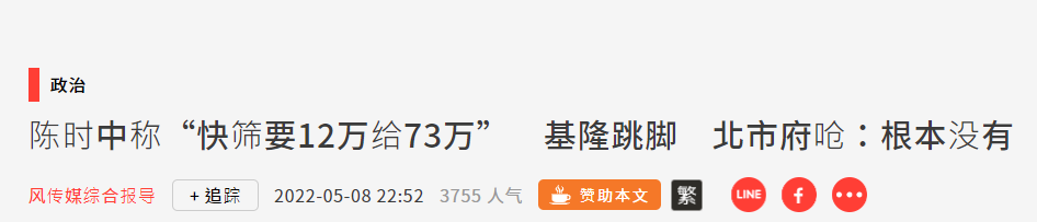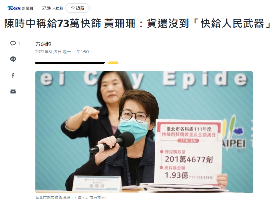 (台媒報道截圖) 不過,這樣的說法再次遭到地方炮轟。 台北市發言人陳智菡表示,陳時中說的73萬劑,本就是指揮中心補助給居家隔離對象的量,但這些也還沒送到;另外的12萬劑,則是台北於5月4日申請的,也是指揮中心應公費發放給地方的,而且只有5月4日-8日的量…… 陳智菡強調:根本沒有所謂“要12萬給73萬的事情”。 陳智菡批評,民進黨當局徵用快篩試劑,本應盡快提供卻扣著慢慢發,還要地方發函三催四請、要民眾排隊苦候,“官員還營造出一副大善人佈施的模樣,怎麼好意思?” 接著台北市之後,被陳時中點名的基隆市,其發言人、觀光及城市行銷處處長曾姿雯,也跟著出來糾正。 曾姿雯說,基隆提的需求是20萬劑,而非3萬劑,“3萬劑根本不用幾天就用完了”,且基隆防疫需求本來就在平均之上。 至於陳時中指地方可自行購買,曾姿雯表示,早在4月14日,基隆就已經在供應平台訂了20萬劑快篩試劑,但廠商至今只出貨1萬劑。 曾姿雯坦言,地方自行購買的管道“有行無市”、根本買不到,這就是前線的實際狀況。