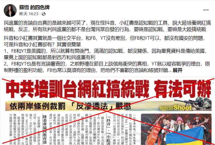 (台灣新黨成員蘇恆Facebook截圖) 對於民進黨當局的“神經過敏”,台灣新黨成員蘇恆也在Facebook發帖怒斥:“民進黨的言論自由真的越來越可笑了”。 蘇恆表示,“寒國人”張紹群就是一個YouTuber,靠著自己的網路節目維生,不過就是在大陸參加一個活動,就影射他是大陸培養的網紅? “究竟是不能和大陸交流,還是不能罵民進黨?”蘇恆說。 蘇恆直言,民進黨所謂的維護地區安全,不過是個冠冕堂皇的理由,真正要維護的,是民進黨的選票安全、執政安全,他們怕有太多人在網路上戳破他們的謊言、批判他們的無能,所以用所謂的“安全”,讓所有反對他的民眾閉嘴。 針對民進黨當局時不時高舉“大陸統戰”棒槌,對內進行各種打壓的行為,不少台灣民眾也看不下去,紛紛諷刺稱:只有做台灣民進黨網軍才是合法的,其他的意見看法都違法,這就是台灣現在的民主自由。